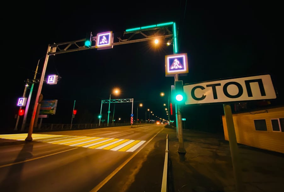 Впервые на региональных дорогах применена технология интерактивной разметки типа «зебра» — эффект достигается при помощи специальных проекторов, направленных на проезжую часть. Все переходы также оборудованы Г-образными опорами с расположенными на них над проезжей частью дорожными знаками со световой импульсной подсветкой, а также электронными табло «Внимание! Пешеход!» со звуковым сопровождением и табло отсчета обратного времени. Кроме этого, здесь есть видеокамеры для контроля соблюдения правил дорожного движения.